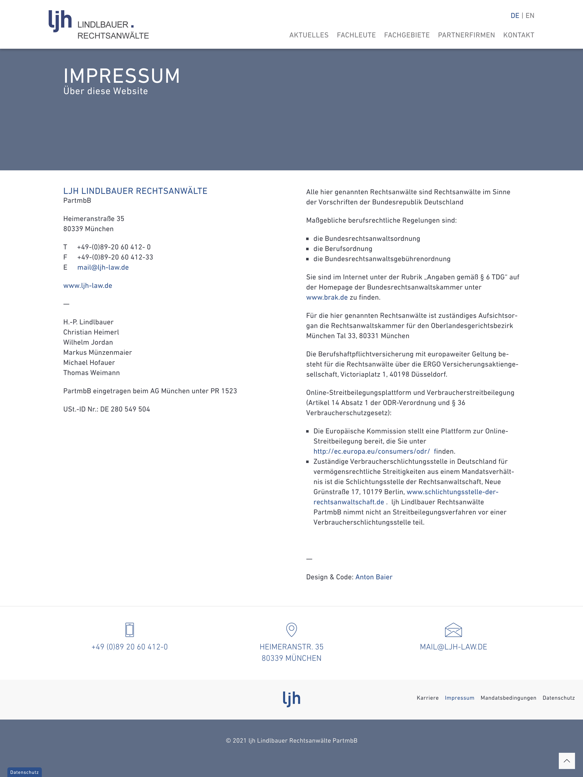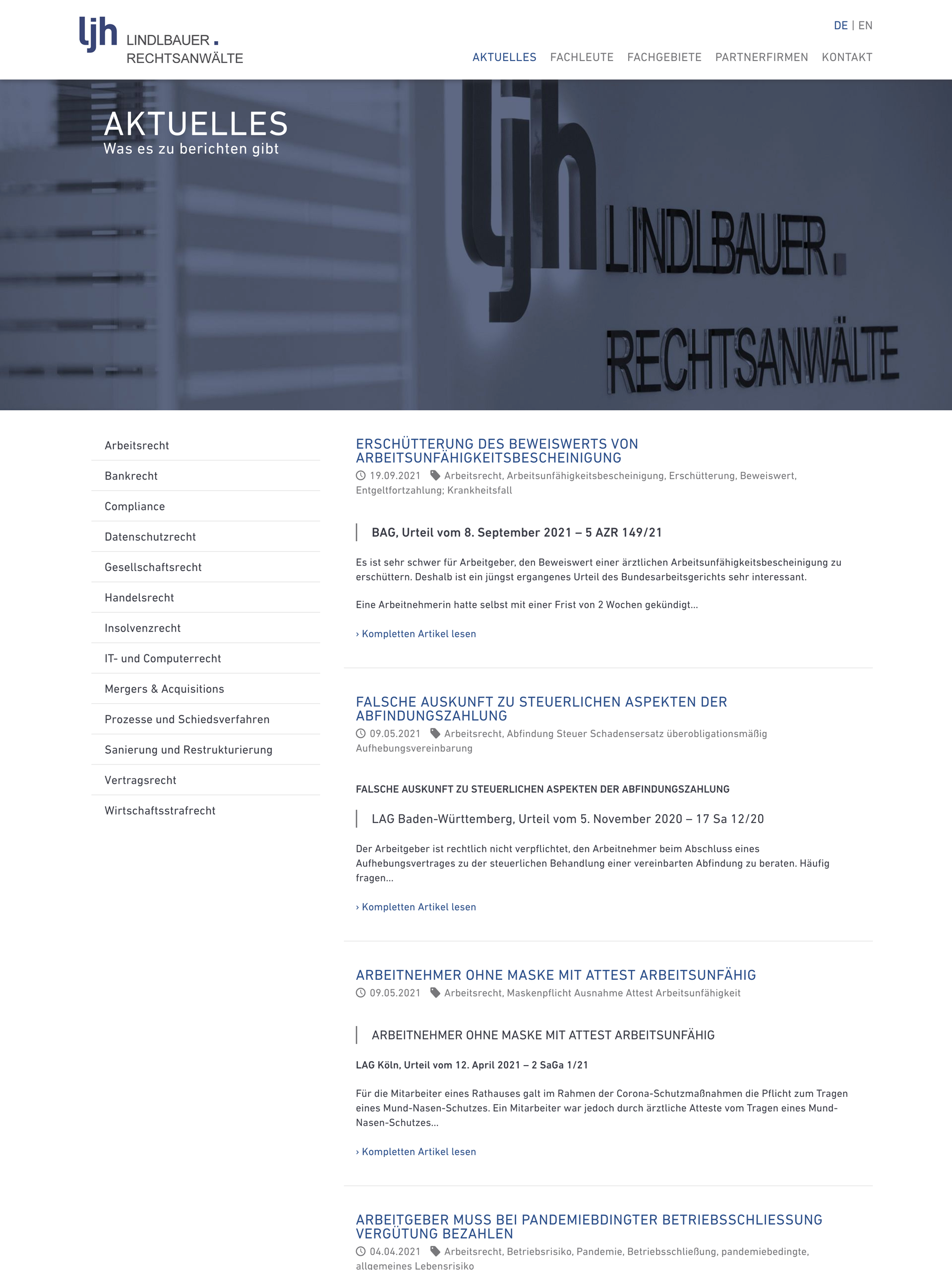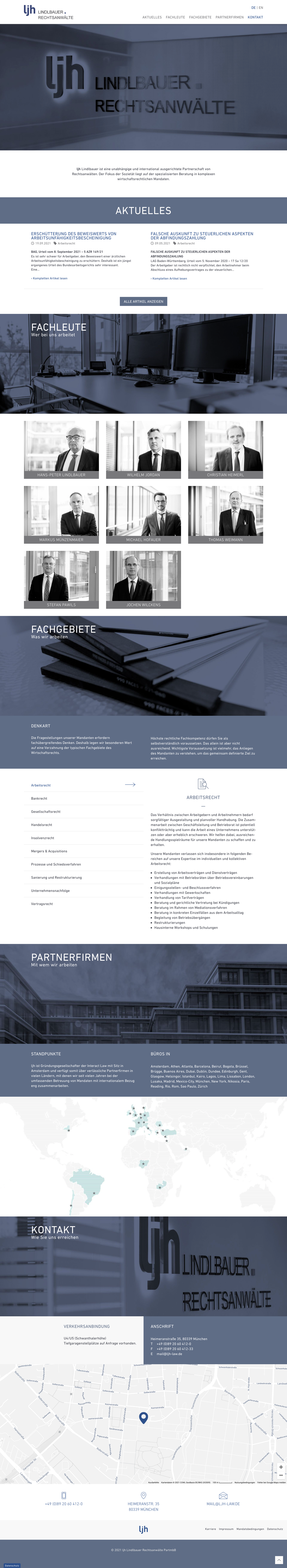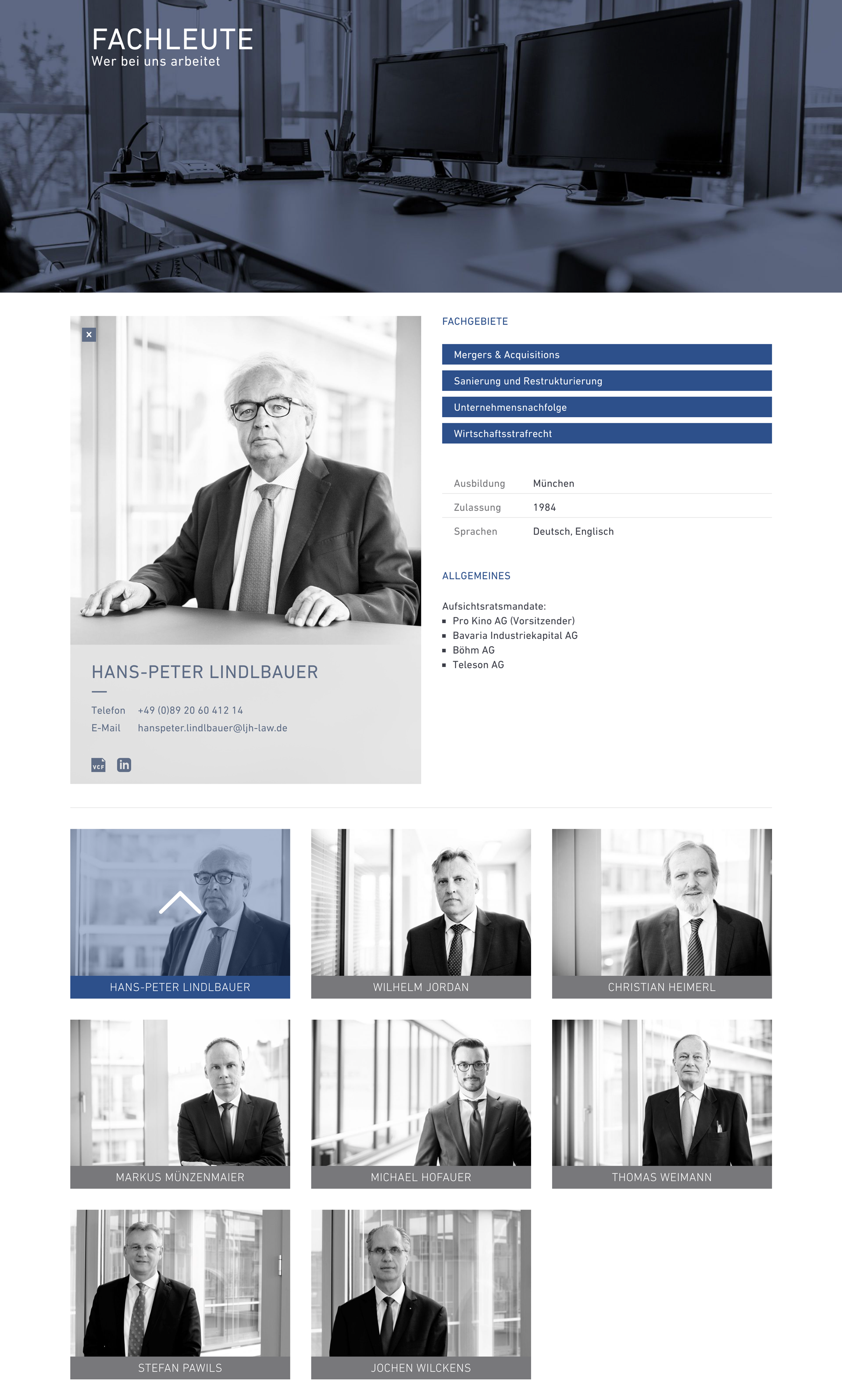 Die Kanzlei ljh Lindlbauer beauftragte mich mit der Neukonzeption ihrer Website. Umgesetzt wurde die Seite auf Drupal 7 CMS im One-Pager-Stil. Die Konzeption und Gestaltung erfolgte in enger Abstimmung mit dem Team von ljh..